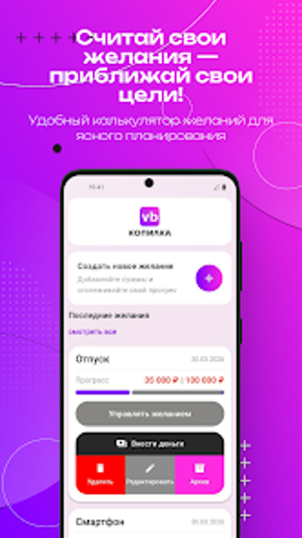 ВБ Копилка is een gebruiksvriendelijke app voor Android die gebruikers helpt om te sparen voor belangrijke aankopen en persoonlijke doelen. Met deze gratis lifestyle-app kunnen gebruikers financiële doelen stellen, hun voortgang volgen en zien hoe elke bijdrage hen dichter bij hun gewenste resultaat brengt. Het hoofdscherm biedt een overzicht van de wensen en huidige voortgang, wat het gemakkelijk maakt om te beoordelen hoeveel er al is gespaard en hoeveel er nog nodig is.